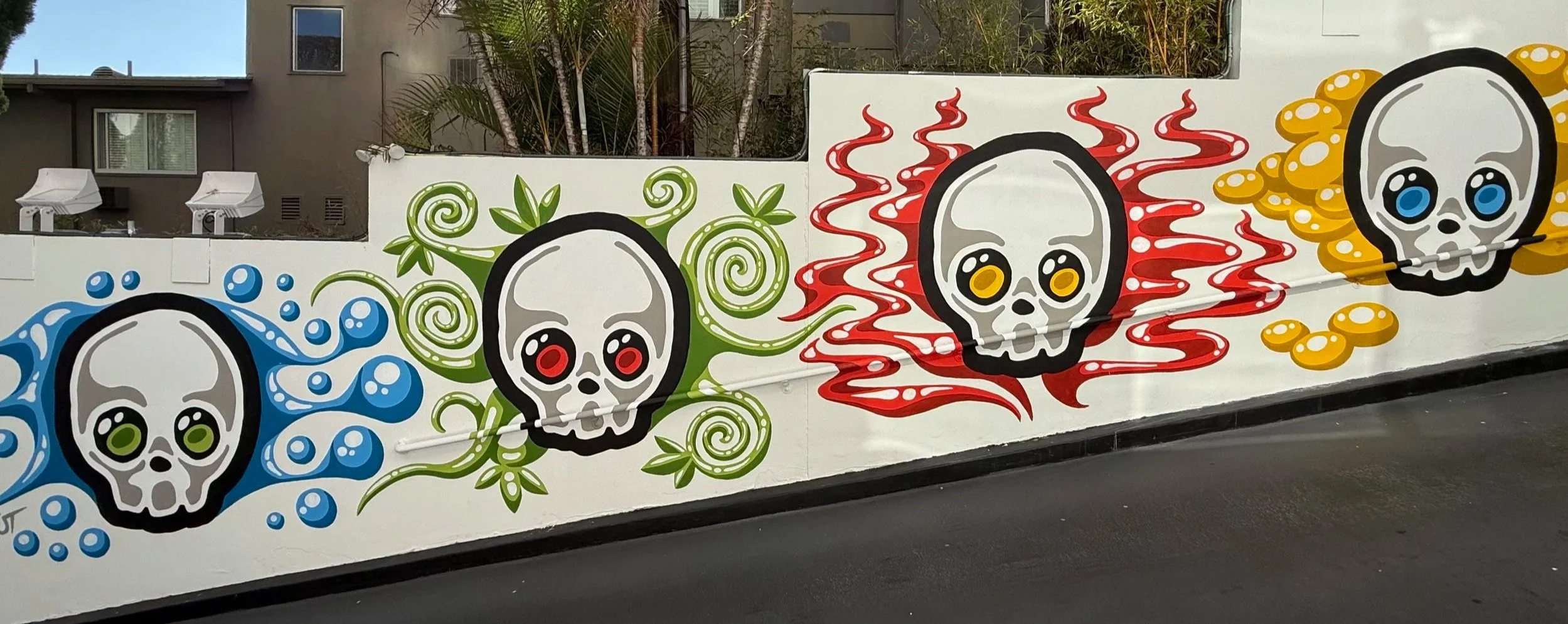 West Hollywood artist Sküt has unveiled a new mural at Skybar in the Mondrian Los Angeles hotel along the iconic Sunset Strip, just in time for spooky season and beyond. The mural, titled Calavera Elementos (2025, Skull Elements), features four bold graphic skulls, each representing a classic Zodiac element: Water, Earth, Fire, and Air.
