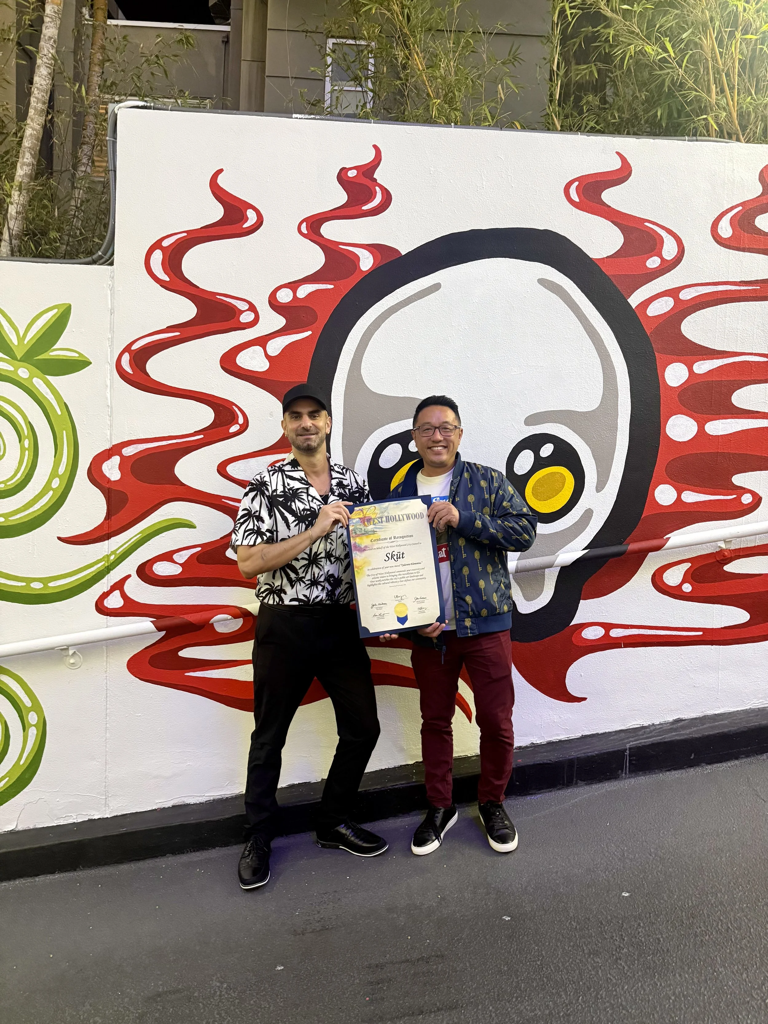 West Hollywood City Council, Councilmember Danny Hang presented a Certificate of Recognition to Sküt in celebration of his “Calavera Elementos” mural that read: “The City of West Hollywood commends your creativity and artistic vision in bringing this installation to life. Your work enriches the city’s public art landscape and highlights the cultural vibrancy that defines our community.”