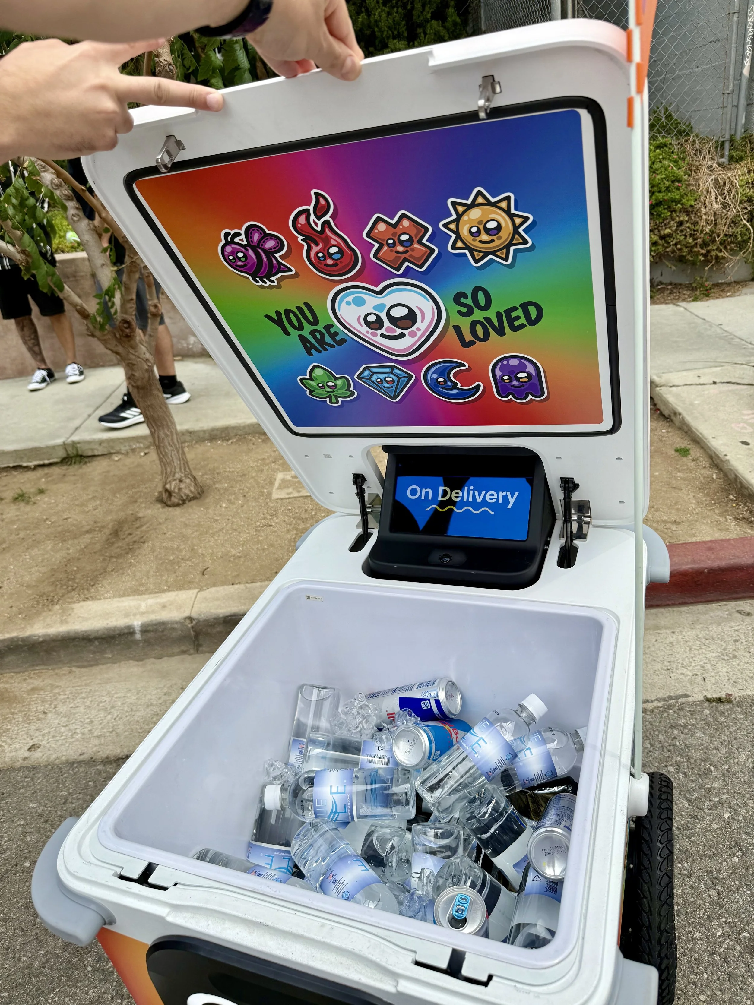 The latest generation of Serve Robotics delivery robots are larger, smarter, and more expressive, offering even additional surface area for creative design. Gilbert also features a customized flag and a hidden message beneath the hood—when customers open the robot to retrieve their delivery, they’re greeted by the affirmation “You Are So Loved,” surrounded by Sküt’s illustrated parade of symbols.