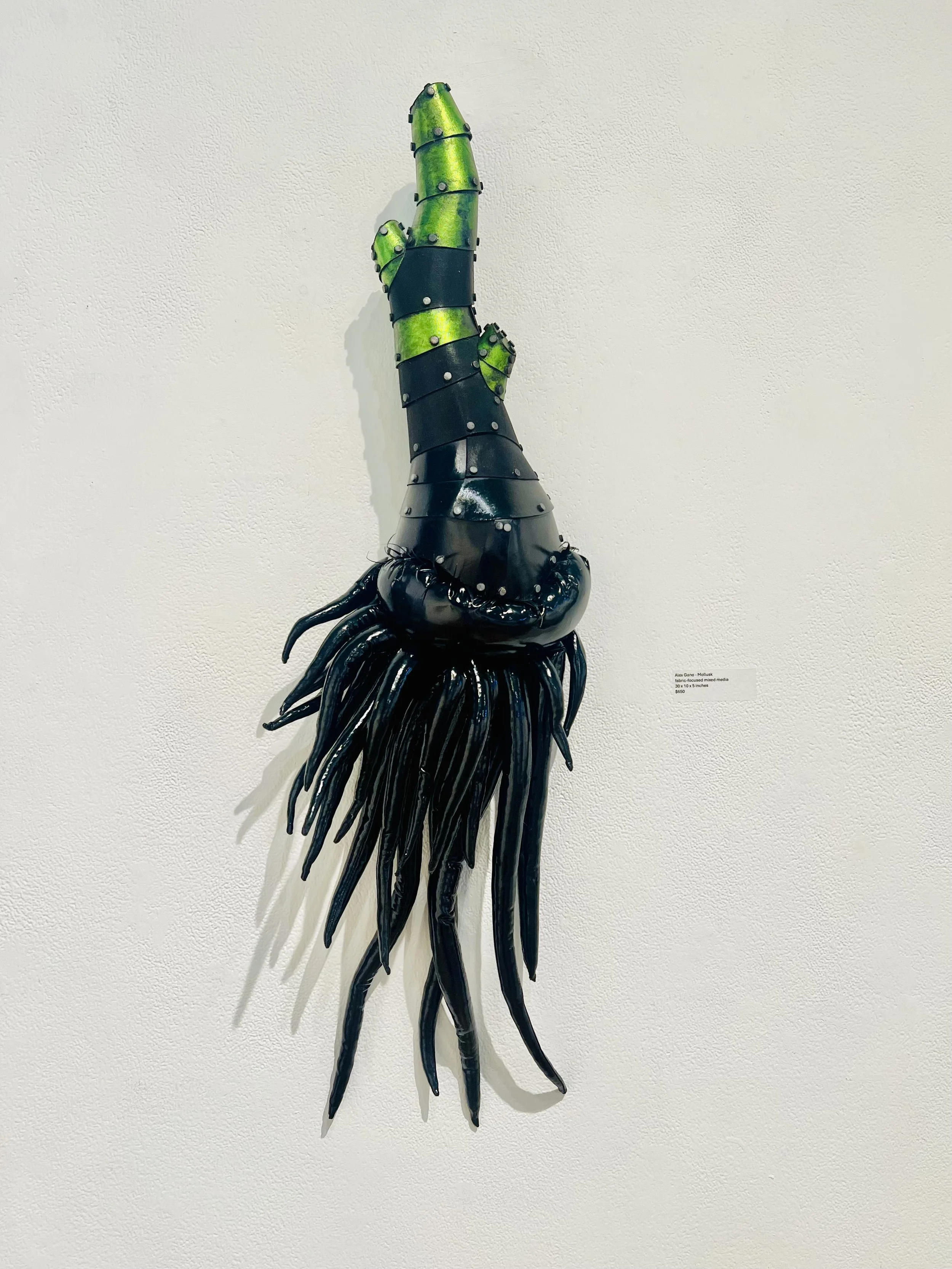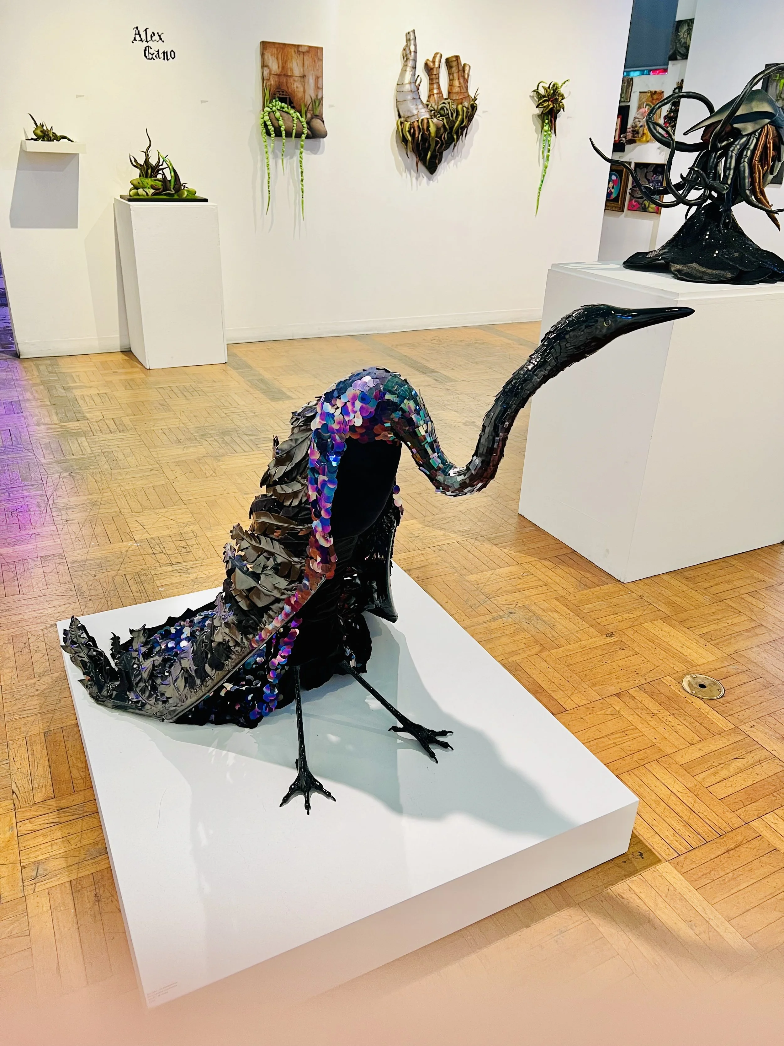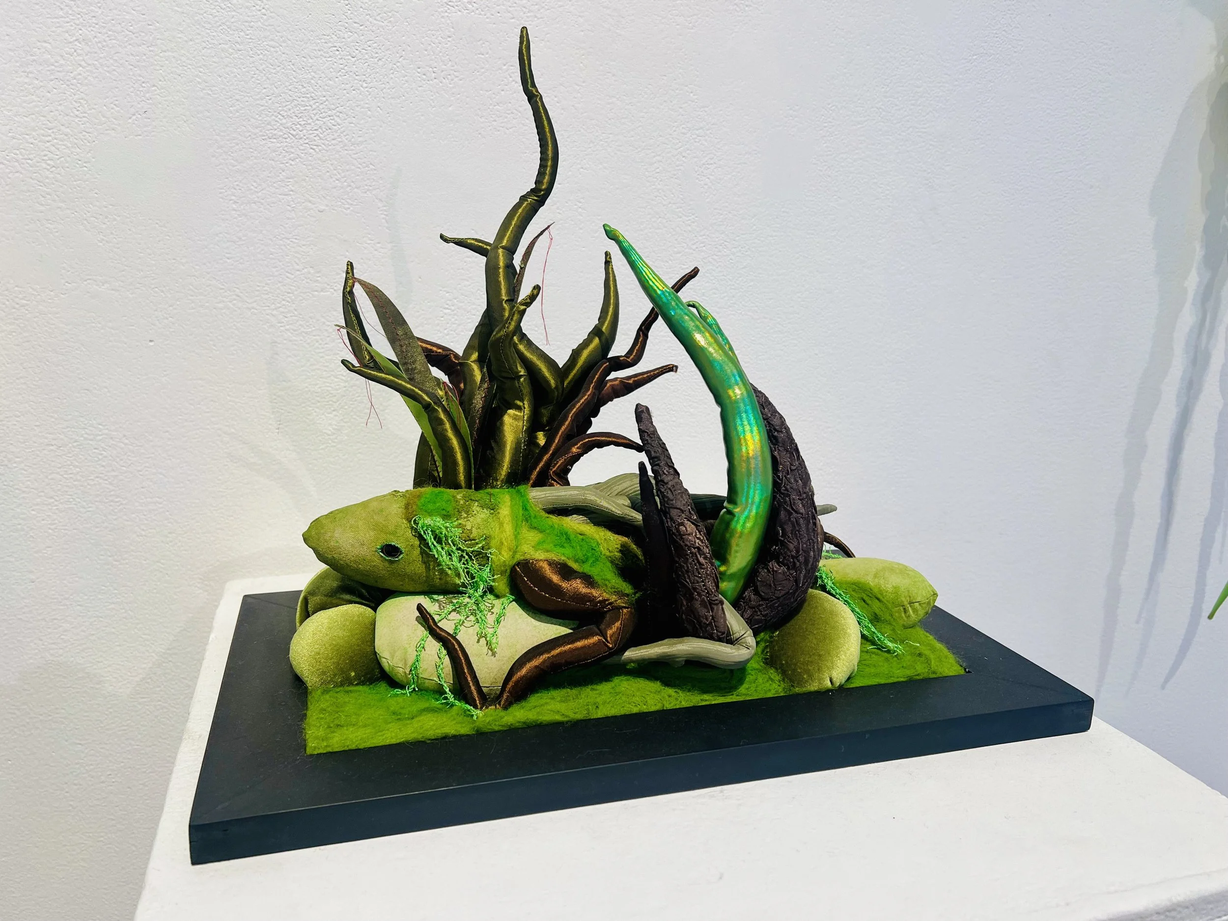 Environmentally conscious artist Alex Gano is exhibiting sculptures that criticize the industries most culpable for pollution through masterful fabric applique.