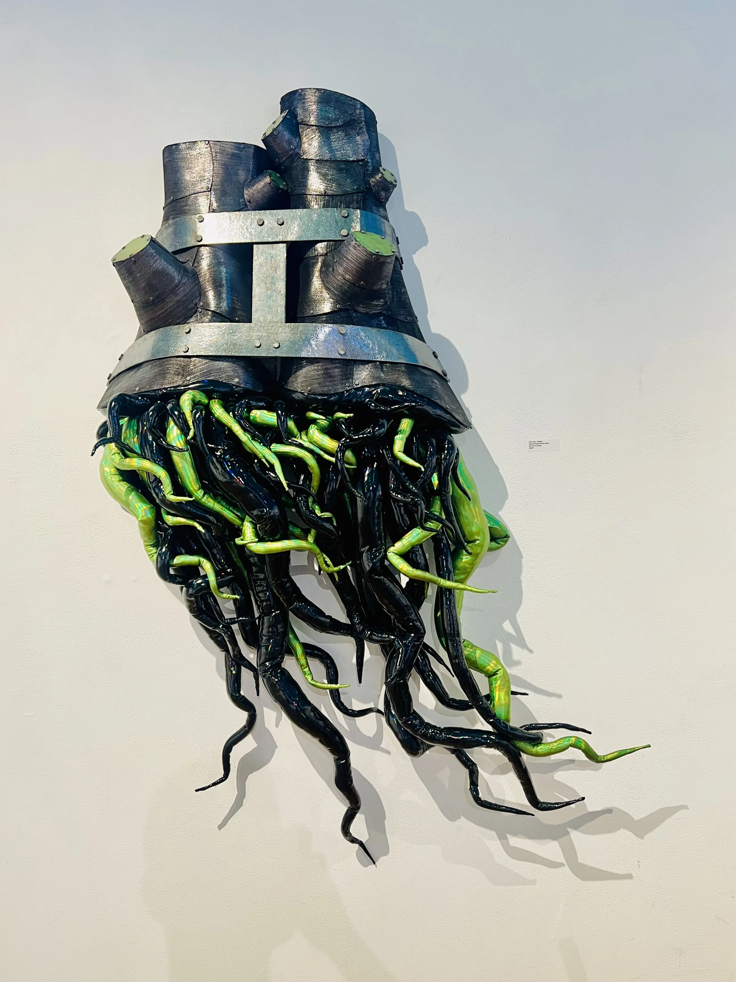 Gano re-contextualizes the aesthetics of industrialization into a narrative that shows the exploitative nature of industry, the impact of industry and the inevitable decay of industry. He plays on the abject horror of nature living amongst pollution using known and unknown creatures, molds and slime.