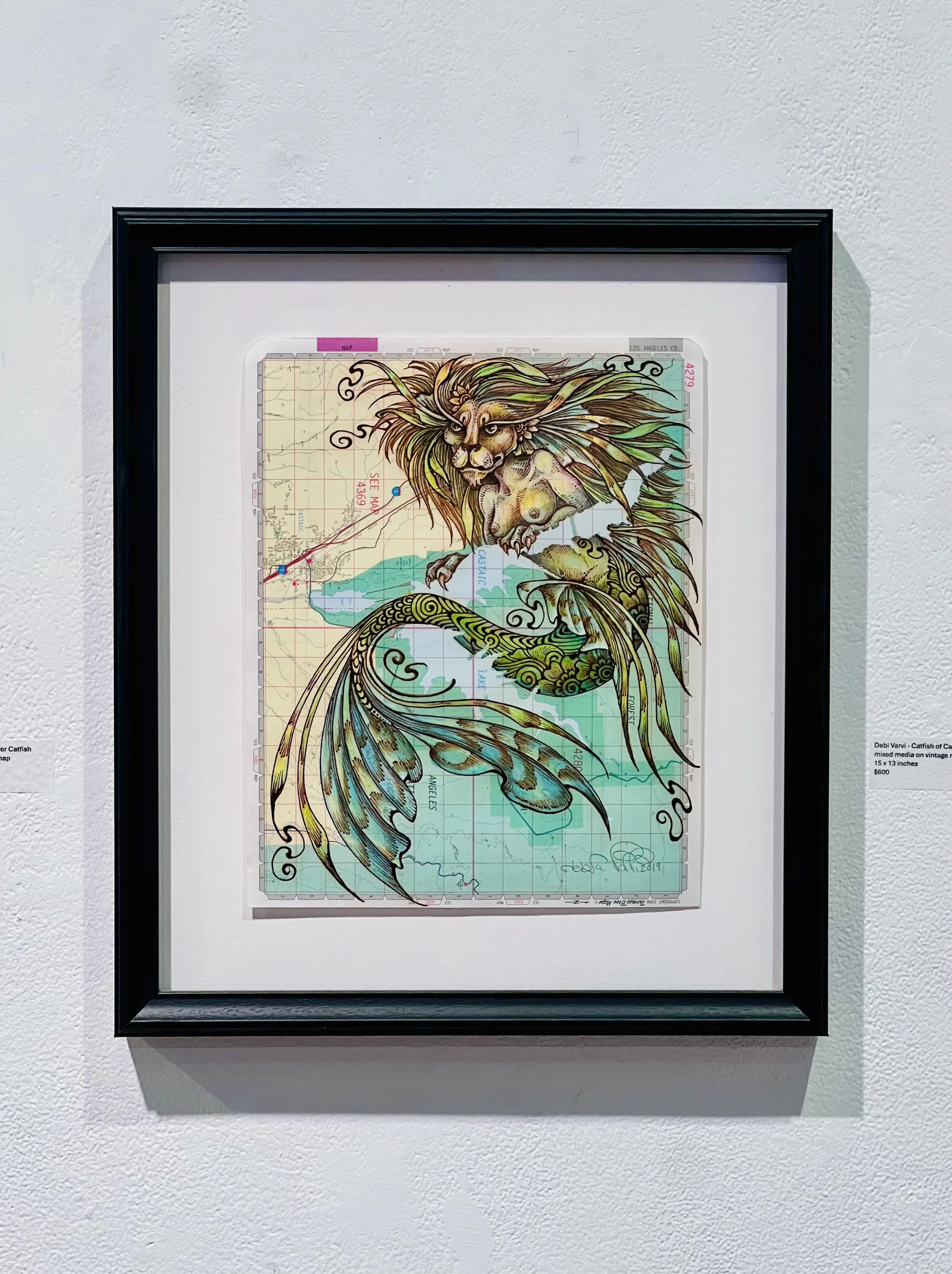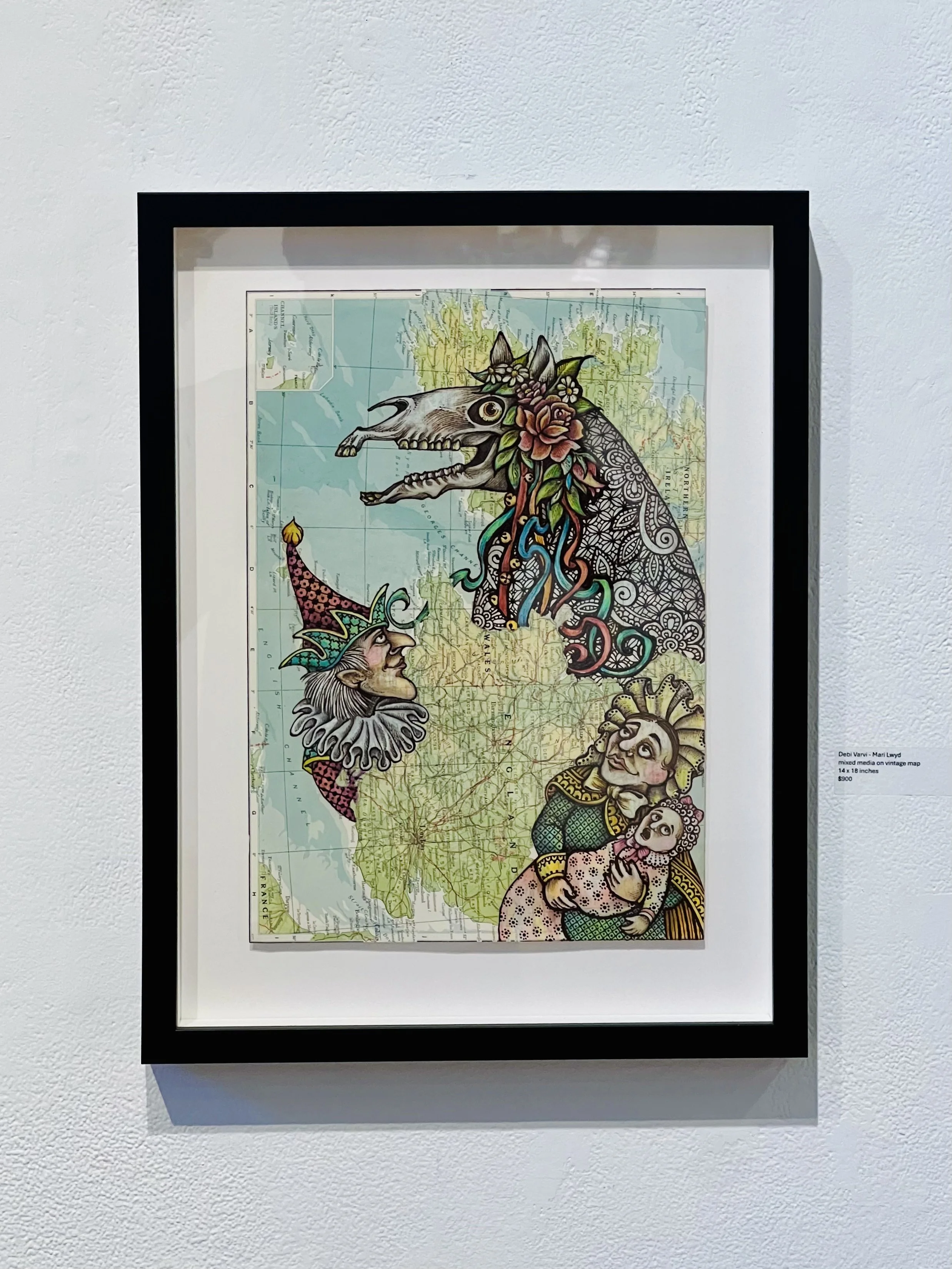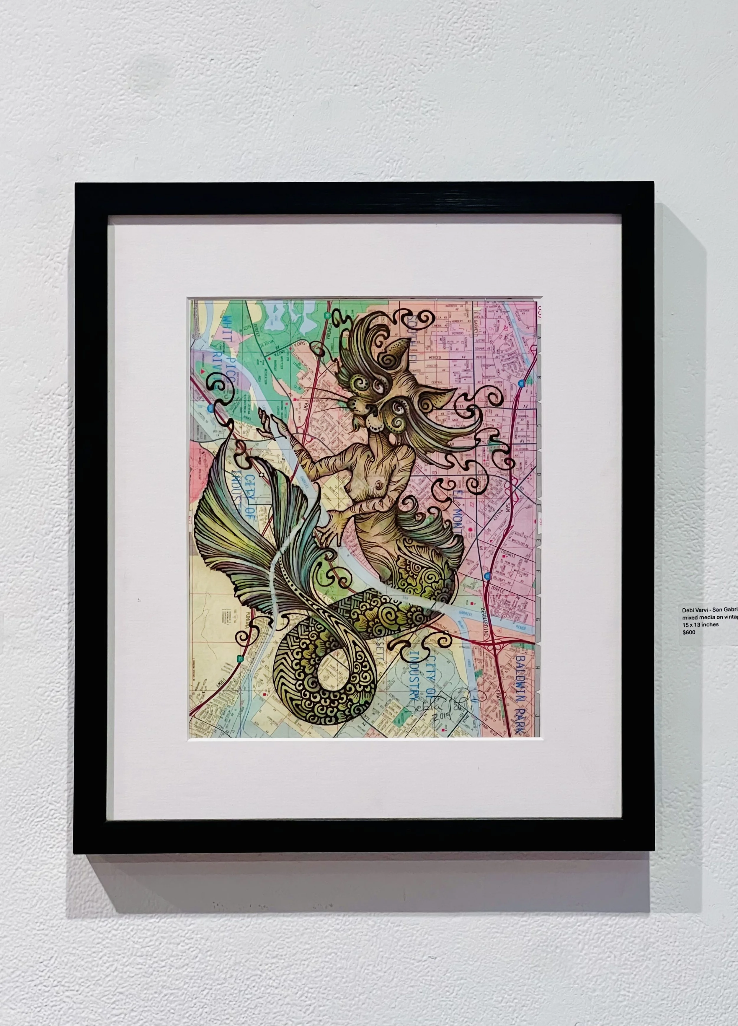 Debi Varvi upcycles maps and reinvents the history of cartes-à-figures by embellishing these maps with allegorical figures representing the history of California. These figures historically add a sense of enchantment to the open spaces while Varvi’s figures take up the expanse of the map becoming the main focus.