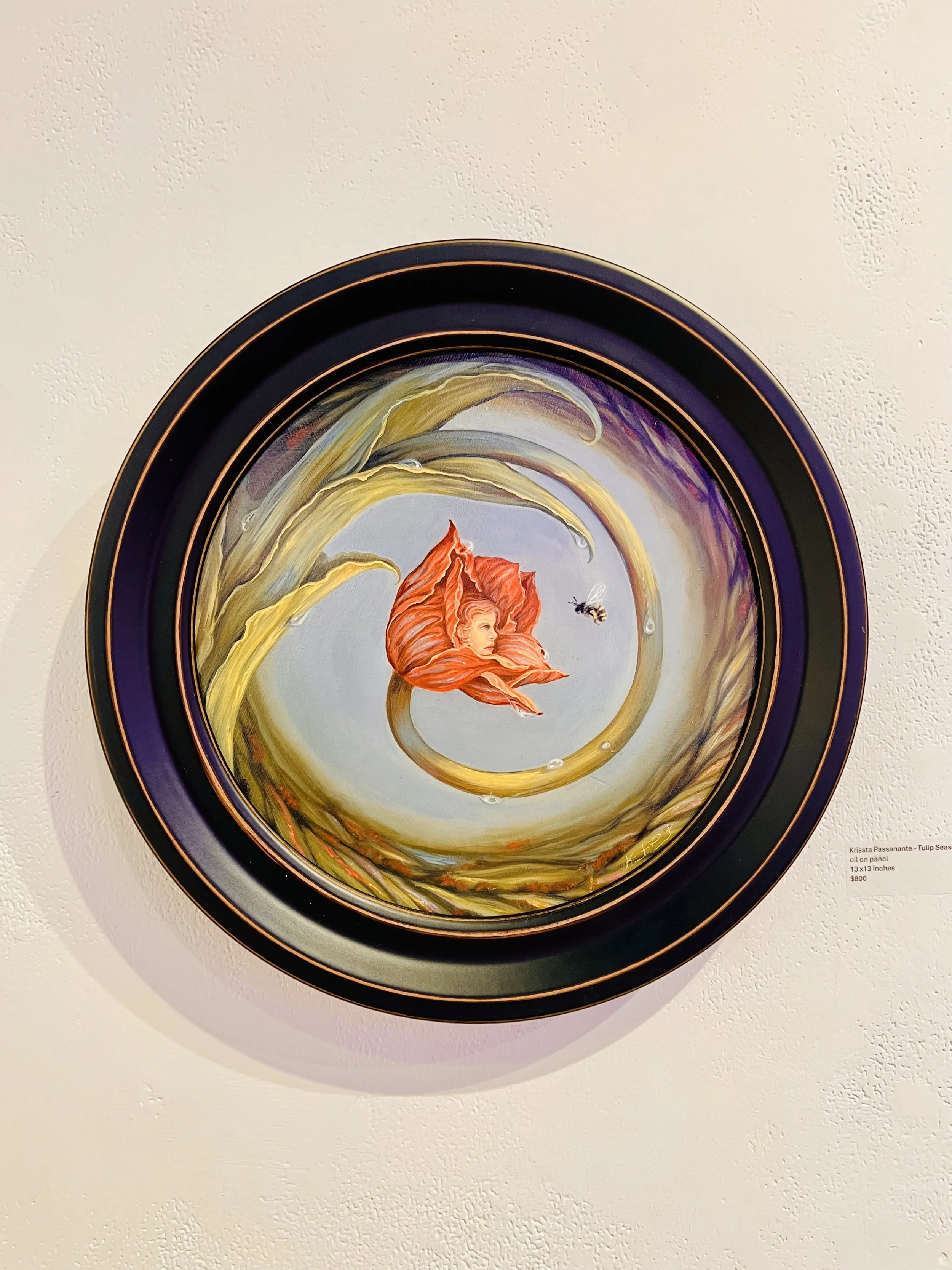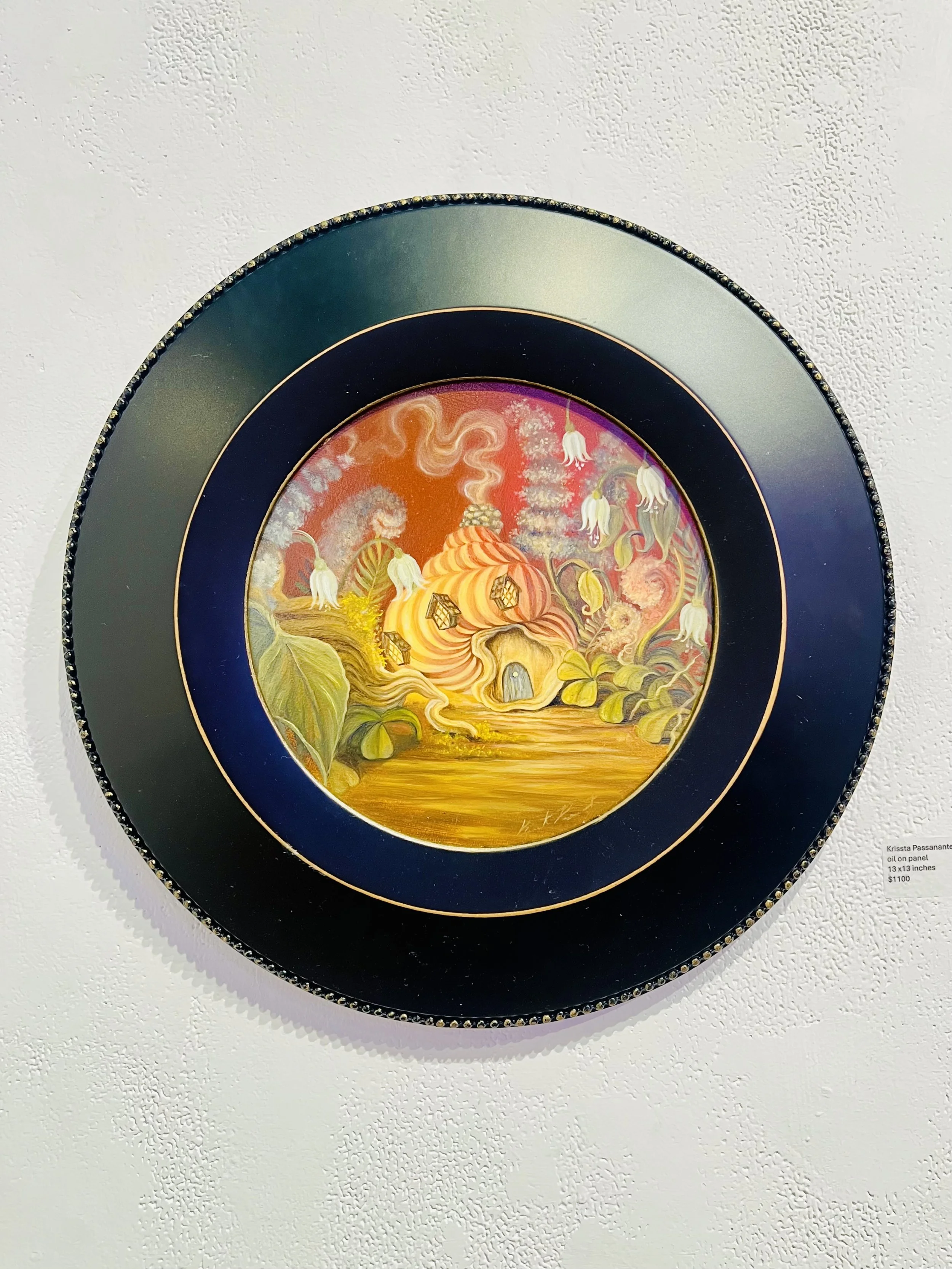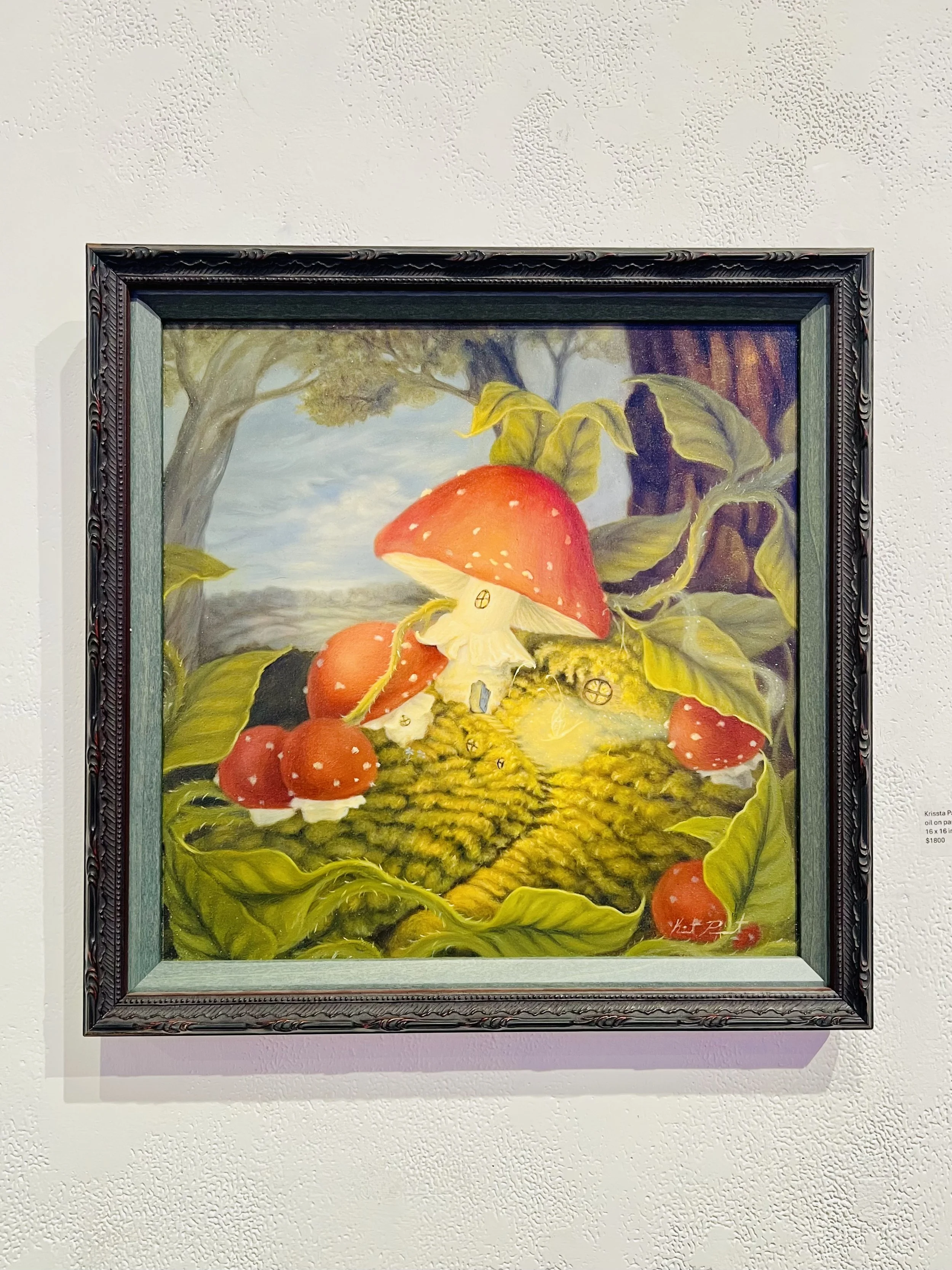 Krissta Passanante paints delicate fairies, gnomes and mushrooms in the fairy tale lighting we all imagined in our childhoods. Anthropomorphic figures and plants evoke fantasy and a dream-like quality.